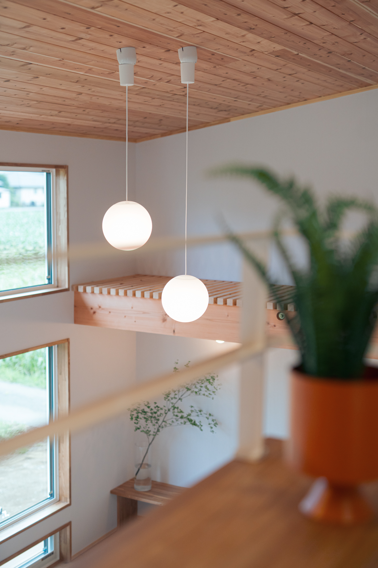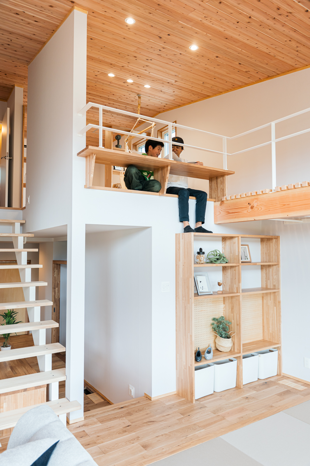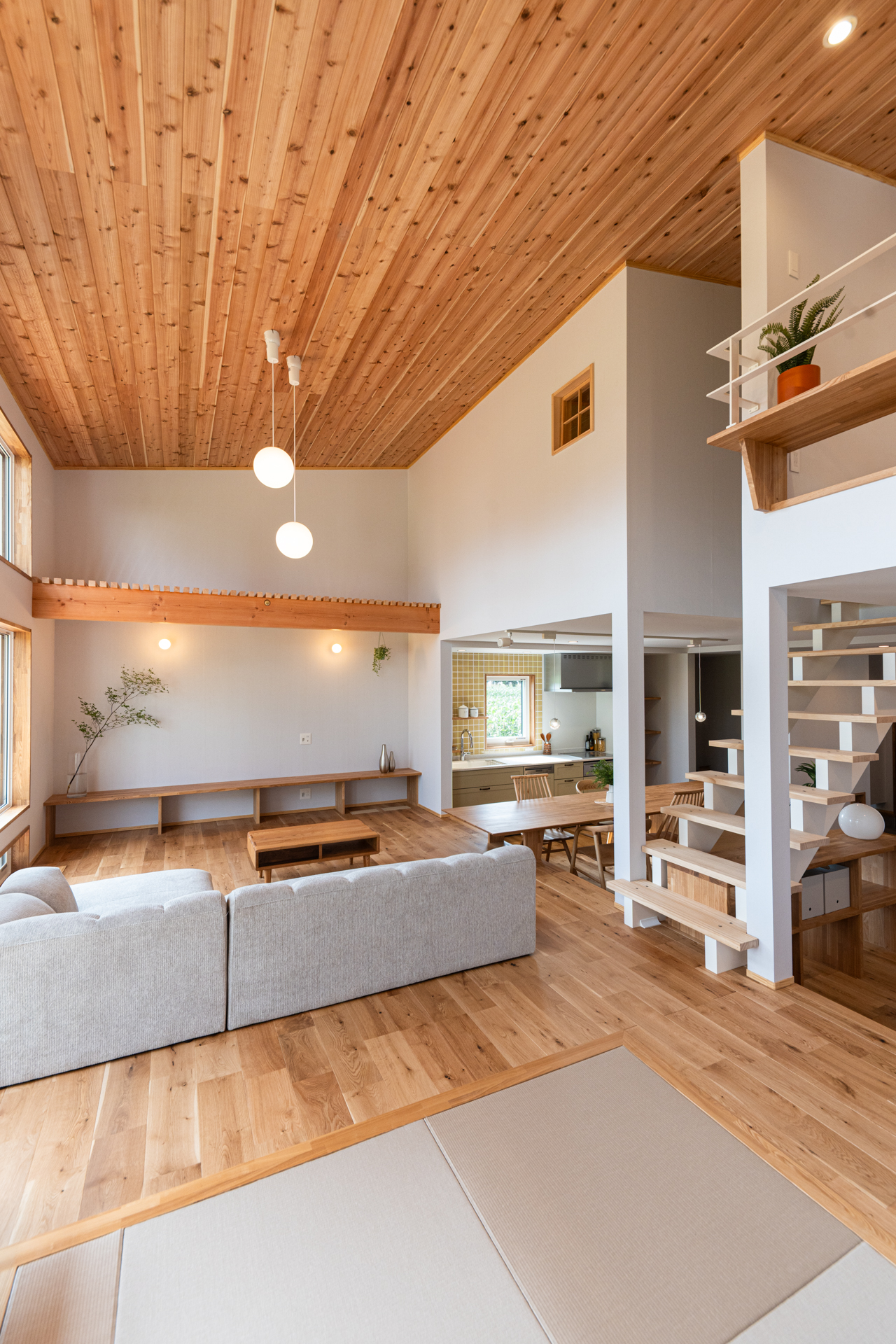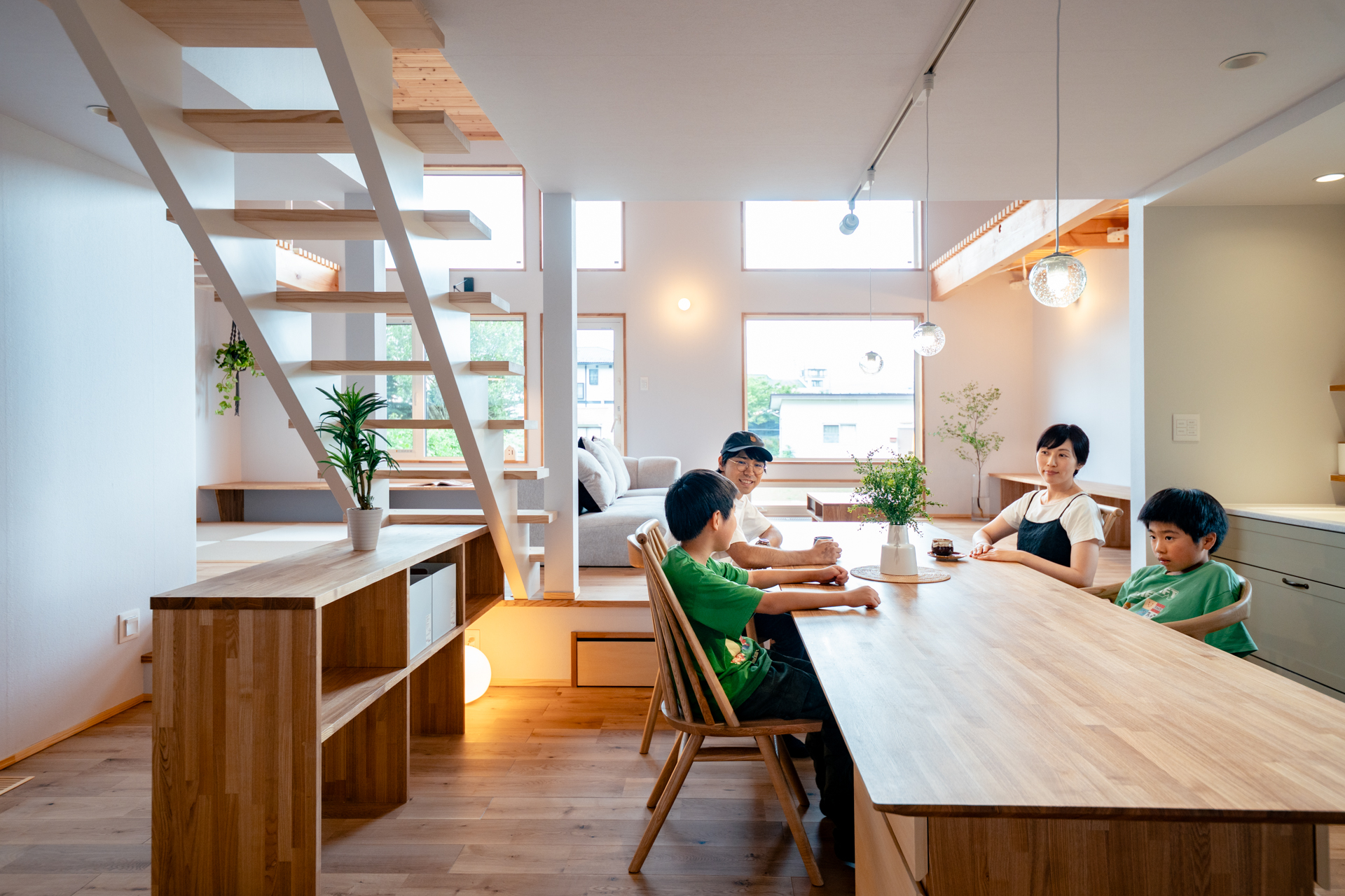 建物の外周部で断熱性能+耐震性能を確保、内部の壁にとらわれず自由な間取りを実現。1階と2階が吹き抜けでやさしくつながる空間です。