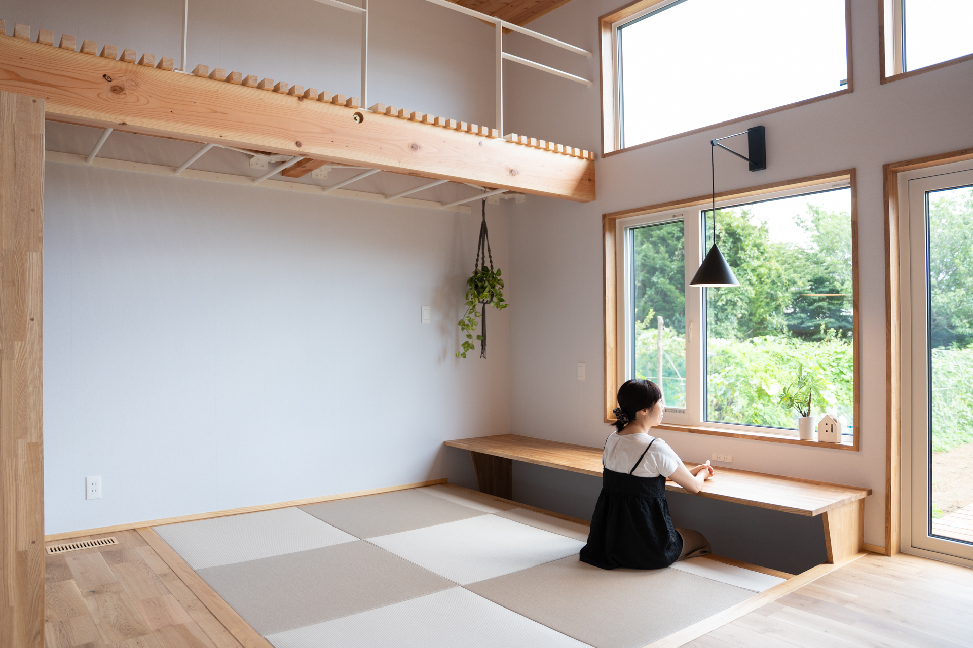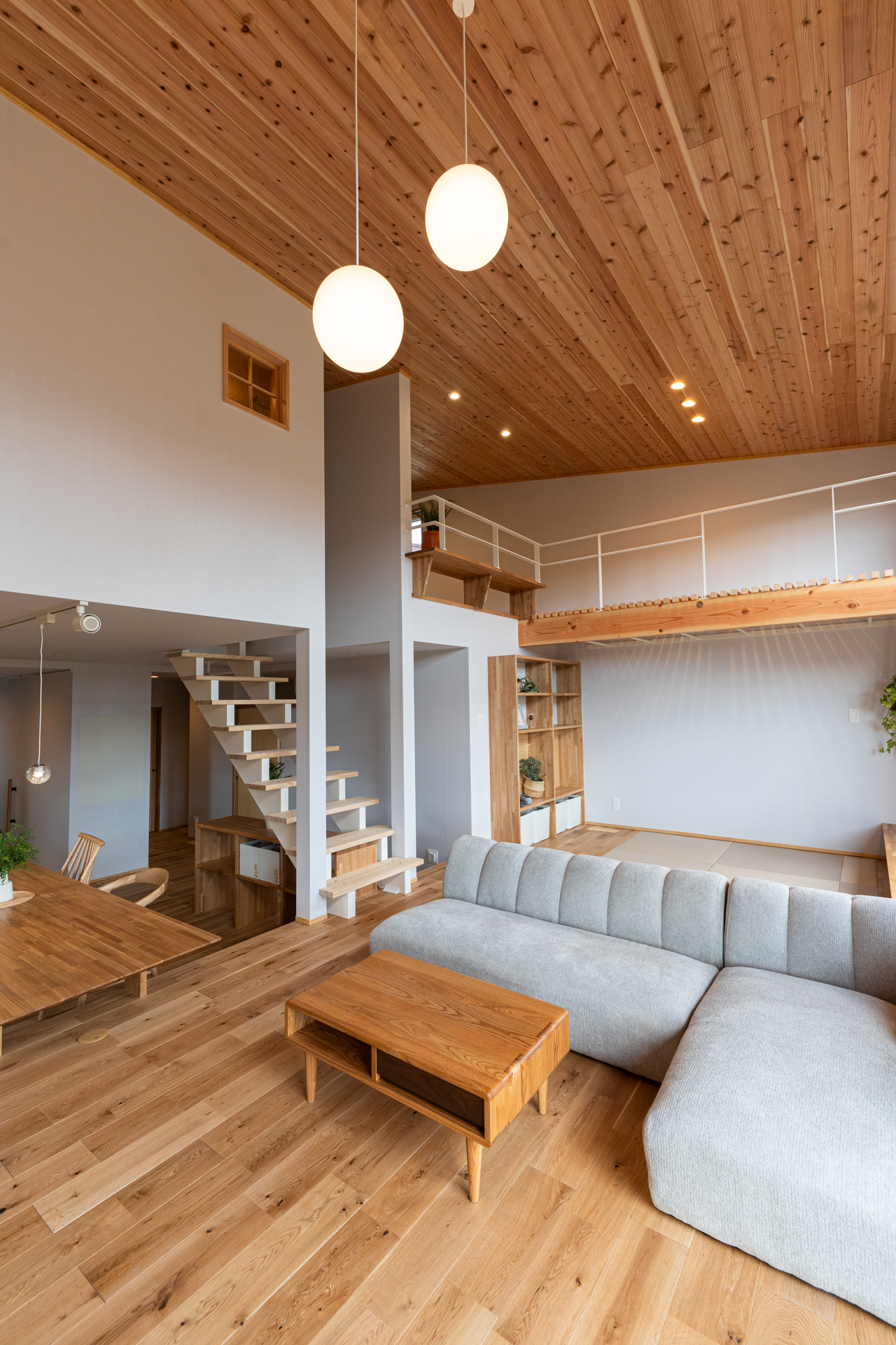 木の天井に、大きなダイニングテーブル。夫婦それぞれの書斎スペースもあり、それぞれの時間も大切にできる間取りです。